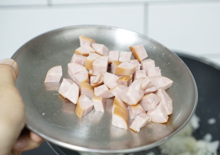 작은 사이즈 양파 반개는 기름을 두른 팬에 볶아줍니다. 베이컨이 있으시면 베이컨을 사용하셔도 좋고요, 아니면 프랑크 소시지나 비엔나소시지를 잘게 썰어서 넣어주세요. 양송이버섯도 잘라서 넣고 함께 볶아줍니다. 약간의 밑간을 위해서 소금과 후춧가루를 톡톡톡 뿌린 후 양파가 익을 때까지 볶아줍니다.